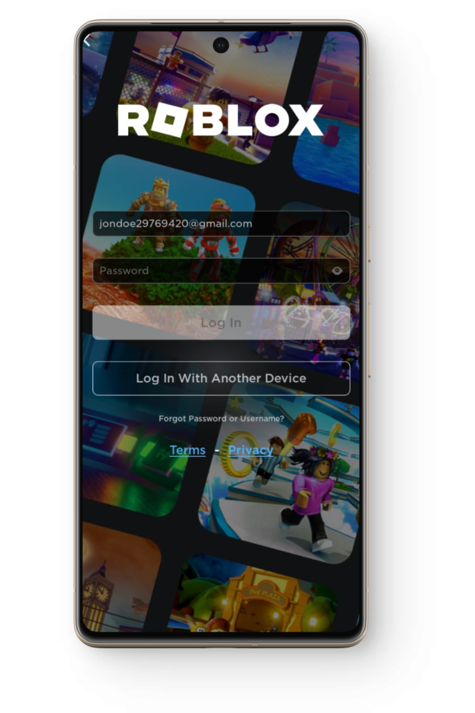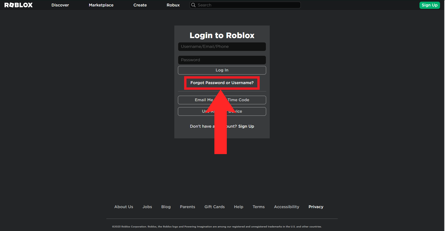 Head on over to the login page of Roblox. Click/Tap on “Forgot Password or Username?” right underneath the Log In button.