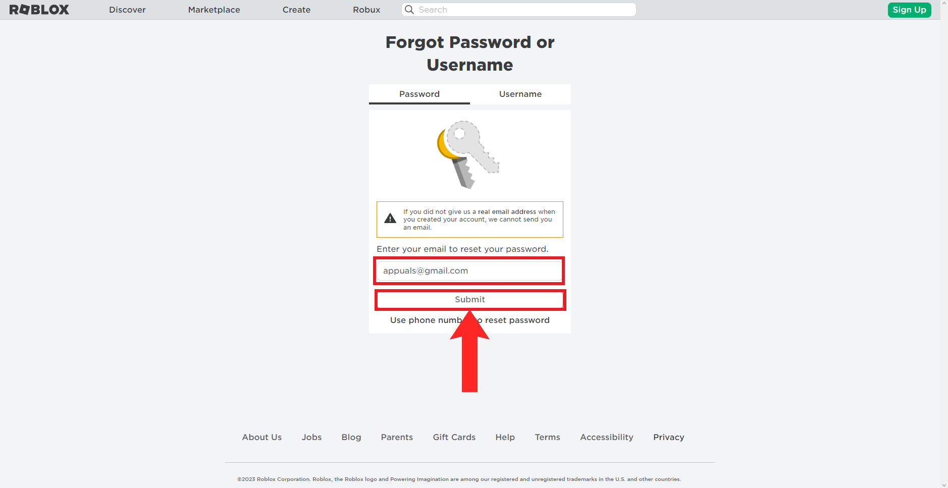 You will be redirected to the Forgot Username or Password page. Enter the email address associated with your Roblox account and click/tap on Submit.