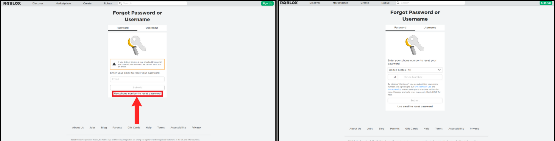Alternatively, you can click/tap on the Use phone number to reset password option under the Submit button. Make sure to choose the correct country and enter the same phone number associated with your Roblox account.