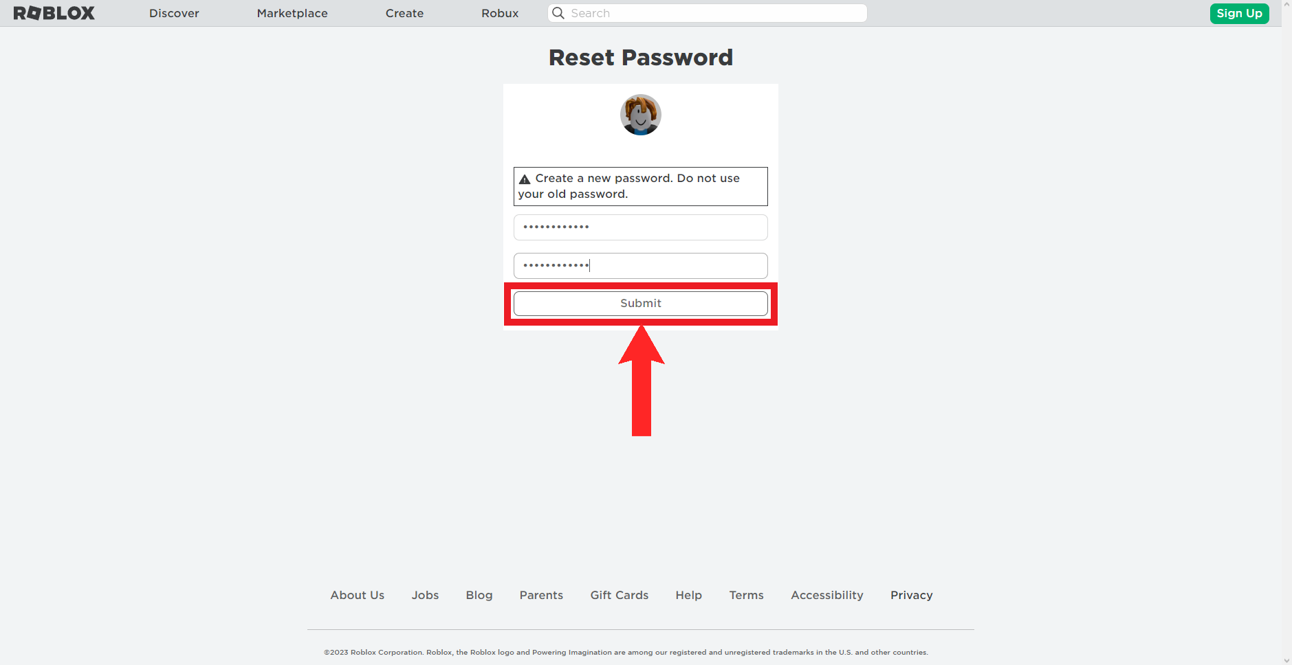 - Check your email or SMS for a password reset message from Roblox, click on the provided link, and enter your new password twice to confirm.