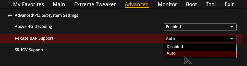 - From there, the option to configure Re-Size BAR Support will become available. Set it to Auto.