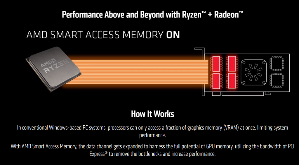 Usually, the CPU only has access to the VRAM is 256MB blocks or 256MB I/O Memory Address Regions. Smart Access Memory removes that limitation and allows the CPU direct access to the entire pool of VRAM. The GDDR memory is traditionally much faster than the standard DDR memory that is used by CPUs normally. The Ryzen 5000 series of processors can access this faster memory and can thus deliver additional levels of performance.
