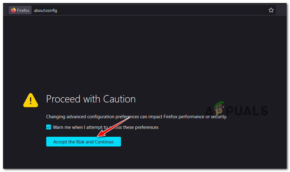 - Open your Firefox browser and type ‘about:config’ inside the navigation bar. Press Enter to access the hidden settings of Firefox.