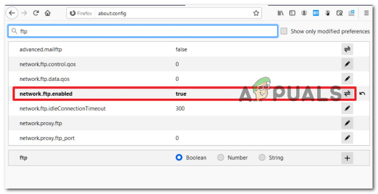 Access the Config menu in Firefox - Once you’re finally inside the Advanced Preference menu, use the search bar at the top to search for ‘network.ftp.enabled’.