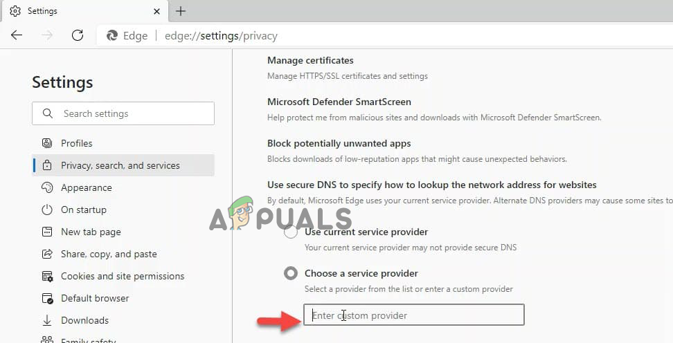 - You can see here Edge is by default using the current service provider. Here enables the option to choose a service provider.