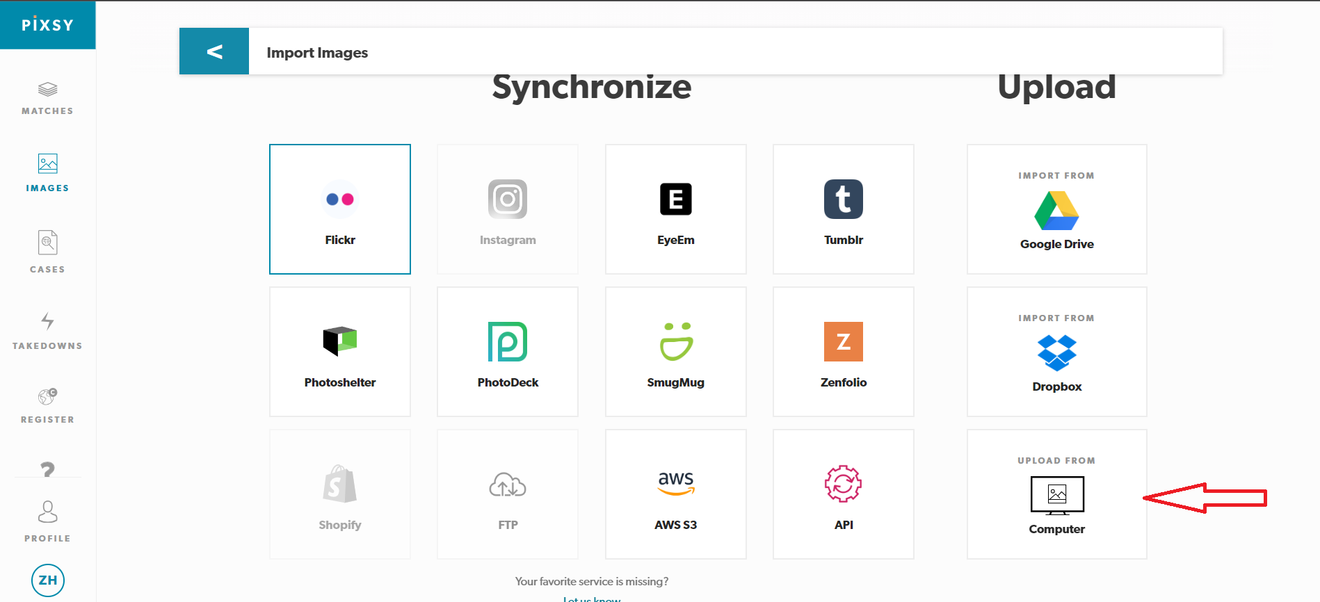 Pixsy homepage - Pixsy allows uploading from multiple platforms, including Instagram. If your image is saved locally, select “Upload From Computer.”
