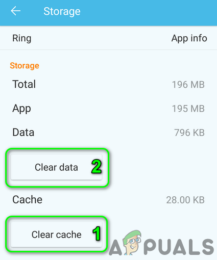 Clear the Cache and Data of the Ring Application - Now restart your phone and upon restart, check if the Ring application is clear of the error.