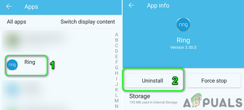 - Now tap on the Uninstall button and then confirm to uninstall the Ring application.
