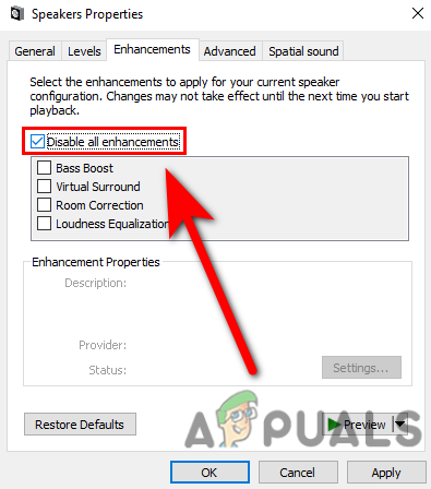 The audio enhancement is an inbuilt function that is used to enhance the audio according to the hardware. it’s good to enhance the audio but the enhancement forces your device to work at full strength and this is not good for hardware devices, for that reason disabling the enhancement might fix your issue.