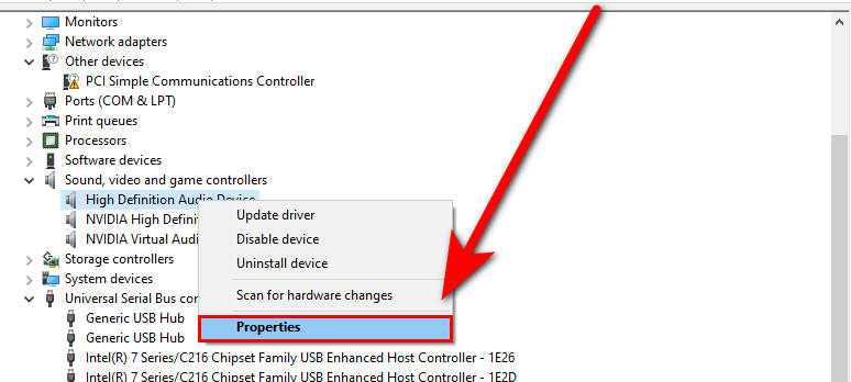 Click on the drop-down menu of Sound, video, and game controller, then right-click on the audio driver and select the Properties option.