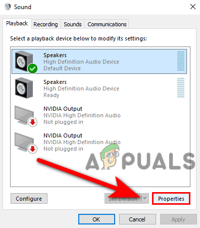 - Select the default speaker Speaker icon then click on the properties.