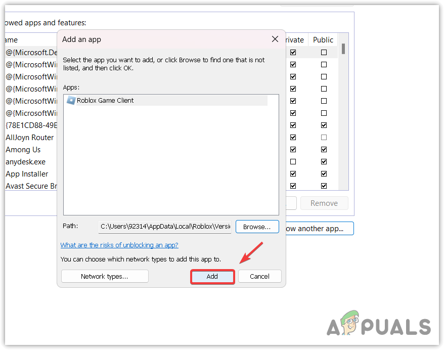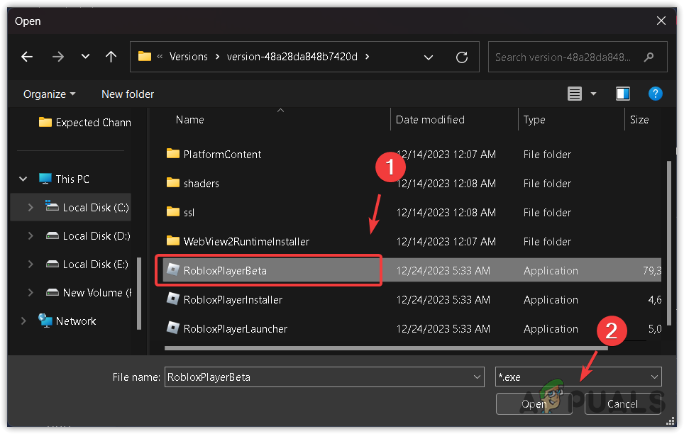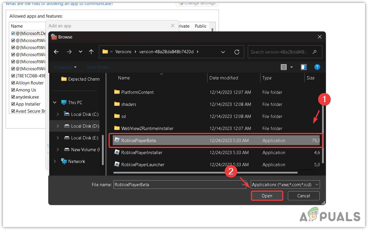 - Select RobloxPlayerBeta and click Open to add Roblox to the list of allowed applications.