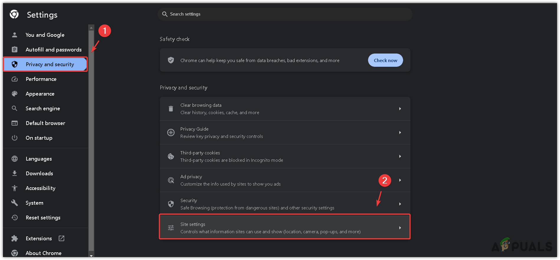 - Within settings, navigate to Privacy and Security > Site Settings > View permissions and data stored across sites.