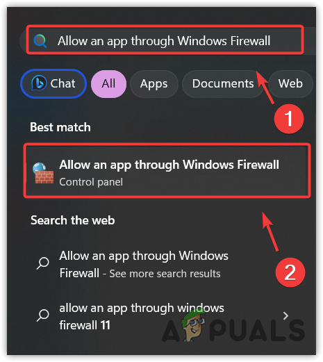 - Click the Start Menu and search for Allow an app through Windows Firewall, then press Enter.