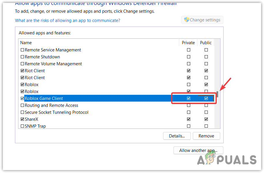 - Ensure that both the Private and Public boxes are checked for Roblox.