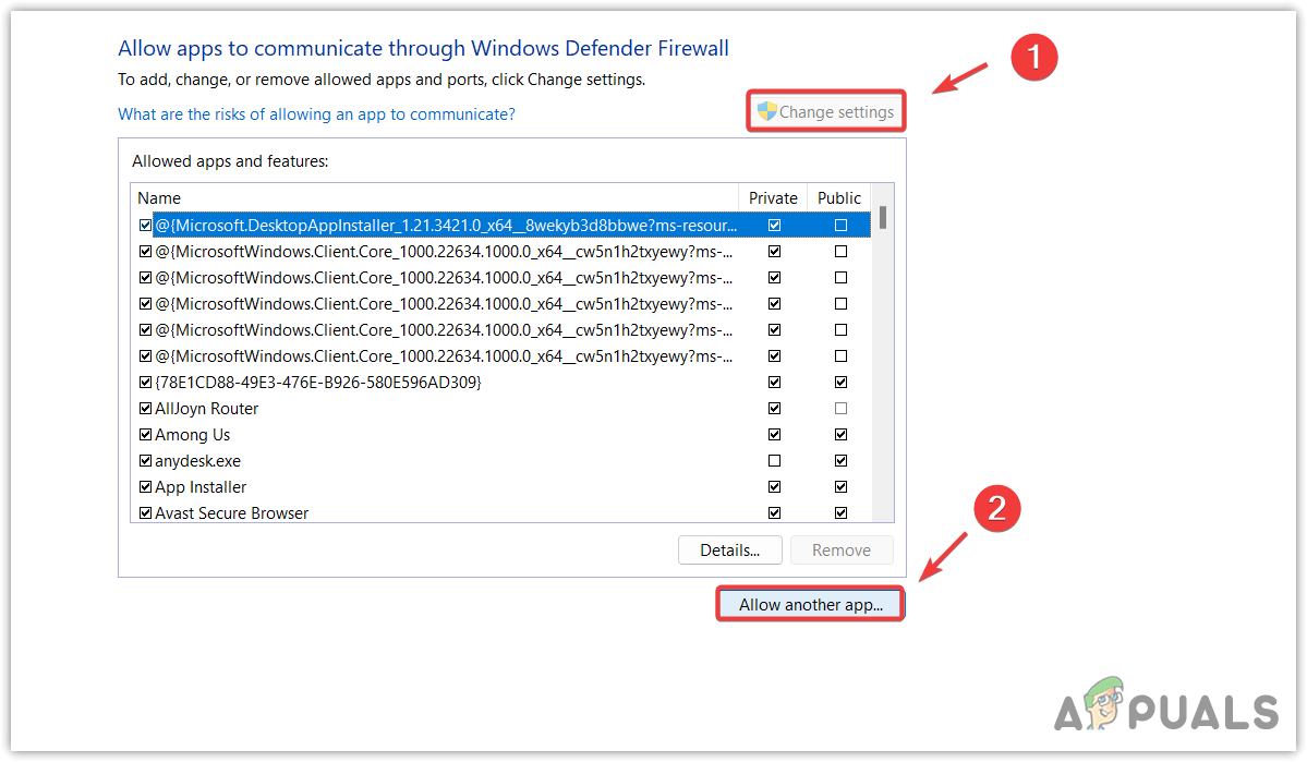 - Navigate to the Firewall settings in the Control Panel by clicking Change Settings, then Allow Another App.