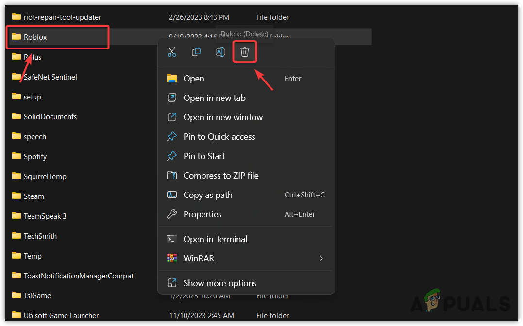 - Locate and delete the Roblox folder.