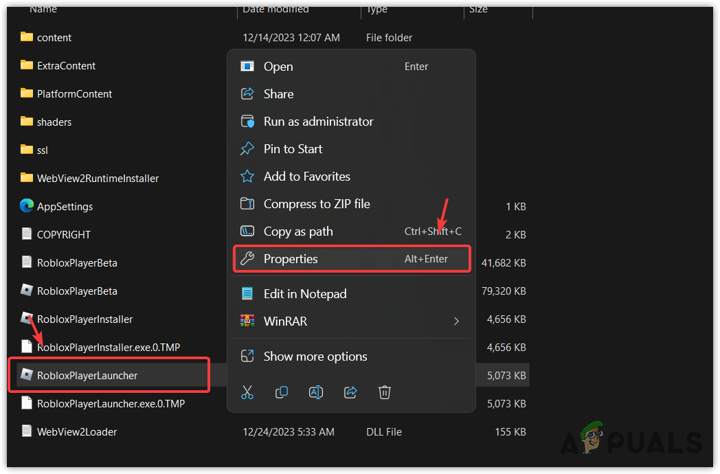 - Right-click RobloxPlayerLauncher.exe and choose Properties.