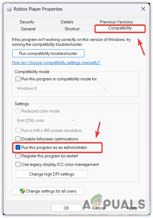Roblox might not have the permissions to access the redistributable files required to launch the Roblox. In this case, we recommend configuring the Roblox to always run with the administrator to avoid the permission issue. To do so, follow the steps: