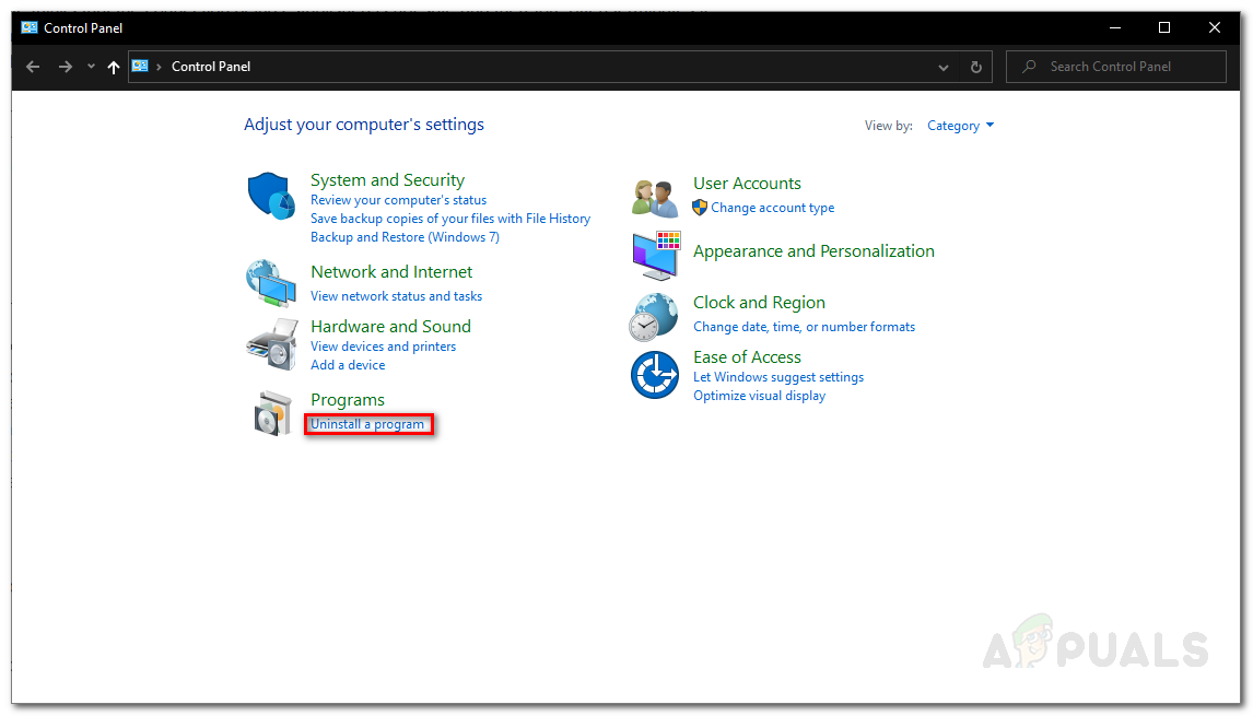 - Go to the ‘Uninstall a program’ section by clicking on it under the Programs entry.