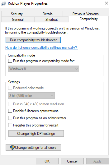 - Click Apply, then OK to save changes, and try launching Roblox again to see if the error persists.