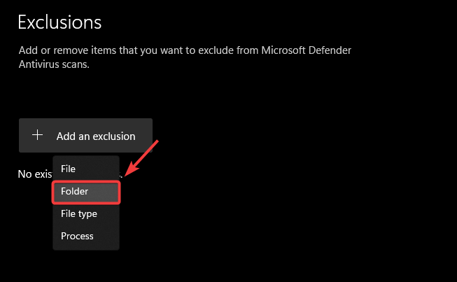 - Click Add an Exclusion and choose Folder.