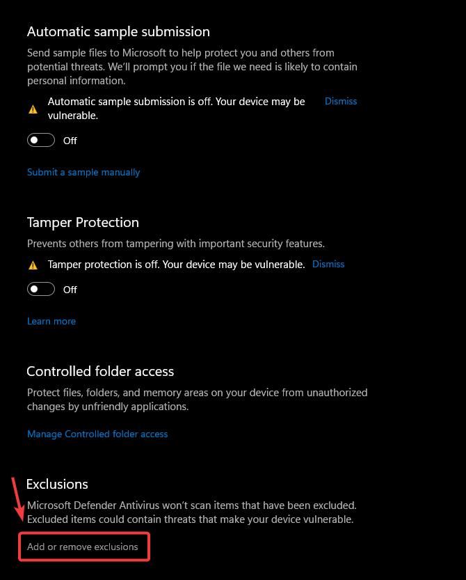 - Scroll down and click Add or Remove Exclusions.