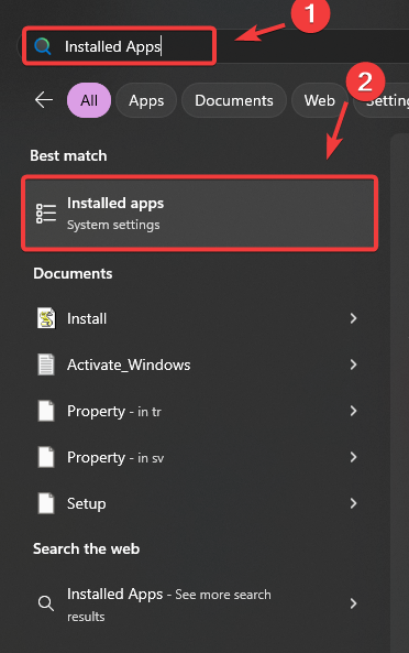 - Open the Start Menu and search for Installed apps.