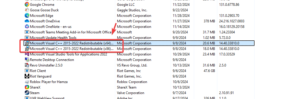 4. Uninstall Microsoft Visual C++ from 2015 to 2022