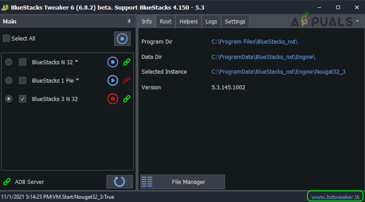 - Now initialize the BlueStacks instance from the BS Tweaker window.