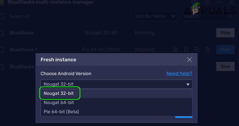 Click on New Instance in BlueStacks Multi-Instance Manager - Now select Fresh Instance and choose an Android version but it will be better to select Nougat 32-bit (the default BlueStacks installation at the time of writing this article).