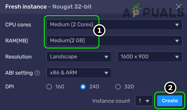 Select Fresh Instance in the BlueStacks New Instance Window - Then click Next and set the CPU Cores dropdown box to at least Medium (2 Cores).