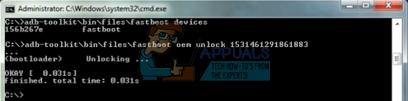 - Now type in the ADB terminal: fastboot oem unlock xxxxxxxxxxxxxxxxx – replace the x’s with your actual unlock code. Your bootloader should now be unlocked.