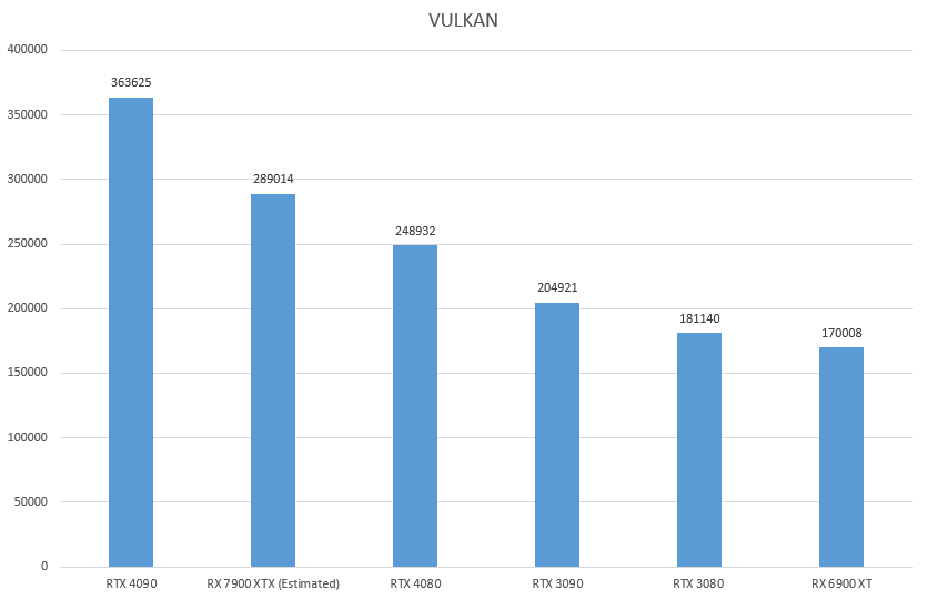 Moving over to VULKAN, the RTX 4080 manages to score 289014 points. The RX 7900 XTX showcased here is assumed to be 1.7x faster than the 6900XT. That may not be the final result, but it can give us a rough idea of where RDNA3 stands. Interestingly, the RTX 4080 here loses to the 7900XTX despite being more expensive.