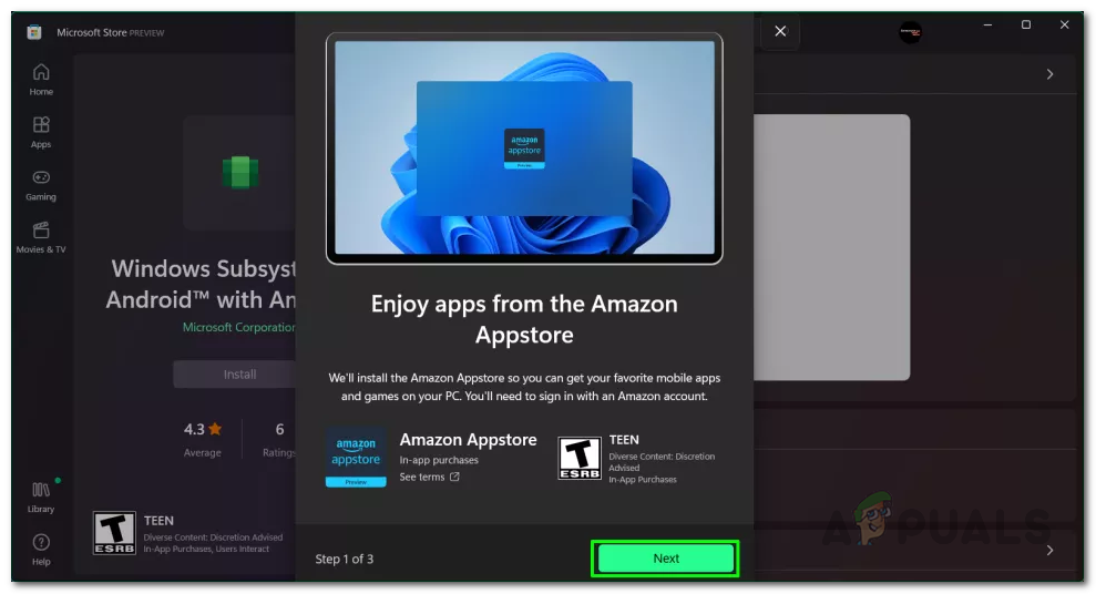 Installing Windows Subsystem for Android - Once you have done that, an overlay will appear that will tell you about the Amazon Appstore. Click on the Next button.