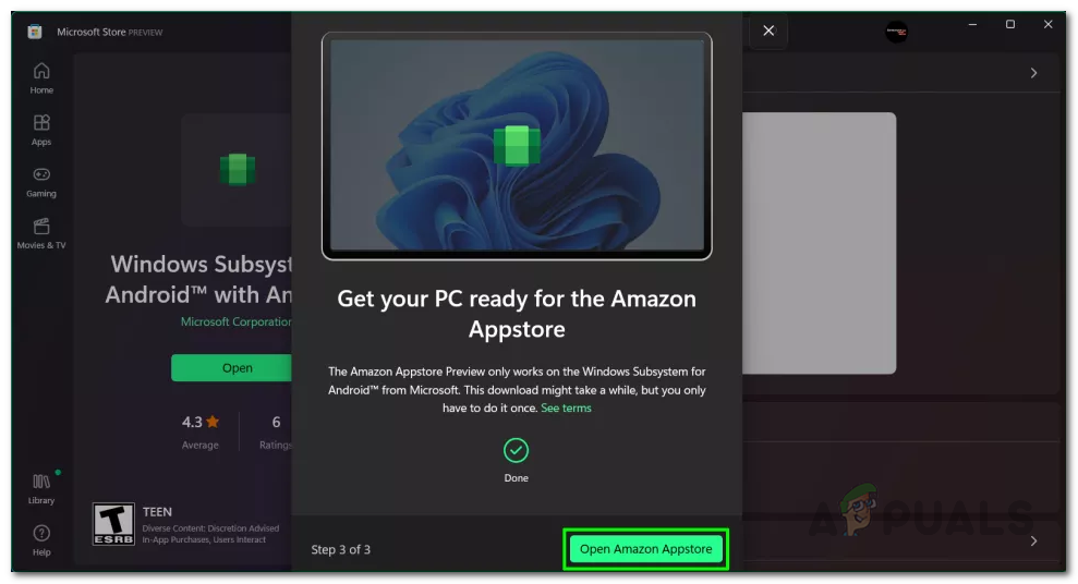 - Once the download has been completed, click the Open Amazon Appstore button.