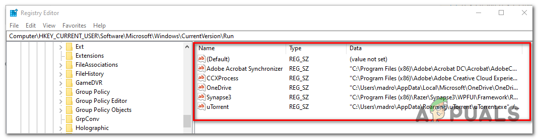 - After you manage to arrive to the correct location, move over to the right-hand side and look for any entry that doesn’t lead back to a known program that you willingly installed. Be sure to look at the location (Data) to see if this list contains evidence of a PuP (Potentially unwanted Program) or remnants of a malware program.
