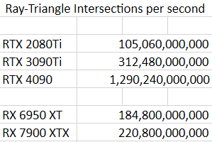 These numbers may look decent on paper. However, on further inspection, we see that instead of a literal slideshow, AMD has promised a ~cinematic video-like experience. Is that a decent improvement? Of course, although you would still be better off without ray tracing. Thanks to Kepler, we see that RDNA3 despite being a somewhat decent increase, is 6x slower than the 4090 in RT instructions per second.