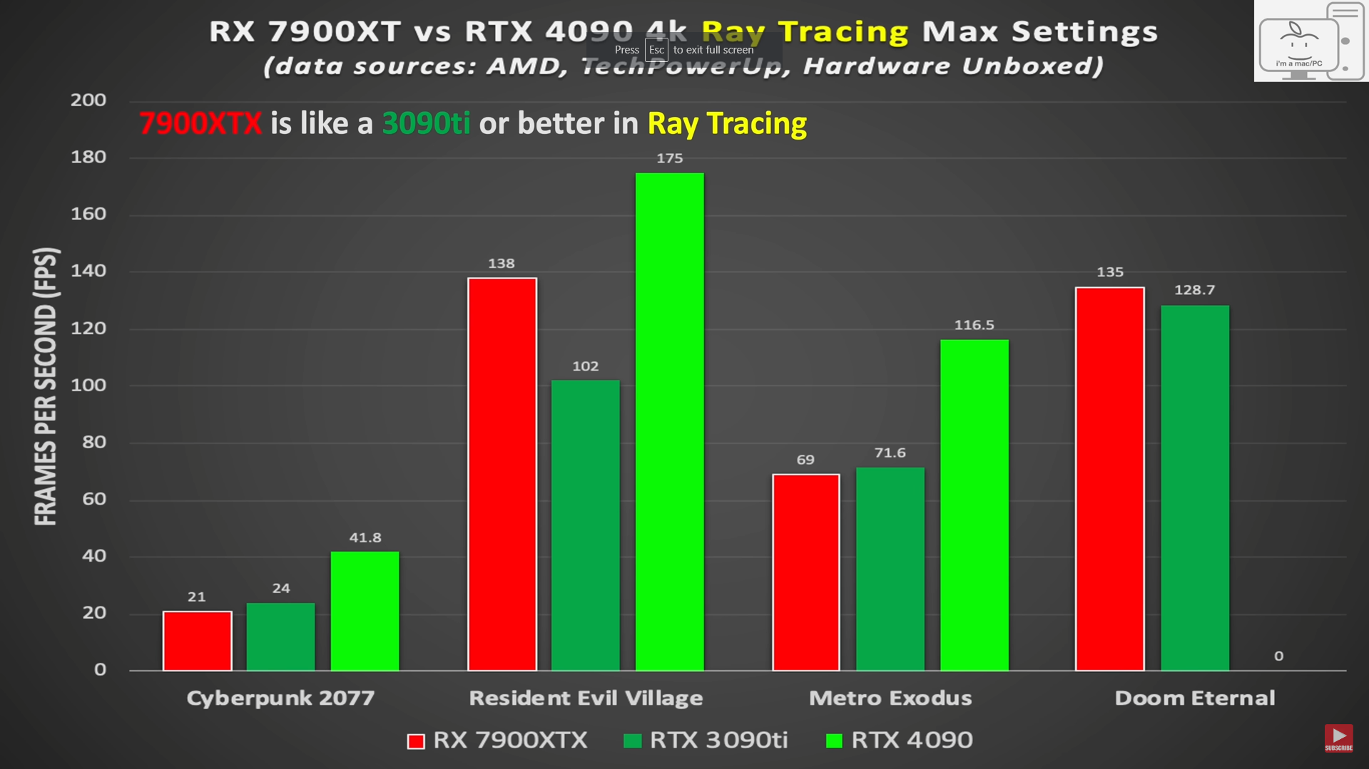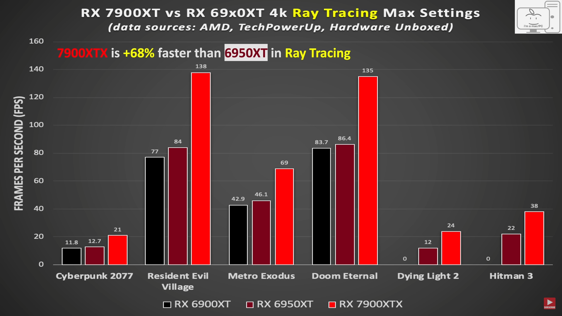 We have a few more charts for real-world numbers, courtesy of I’m a Mac. The RX 7900 XTX is on-average 68% faster than the 6950XT in ray tracing. Against NVIDIA’s best, it is equal to a 3090 Ti, or 20% slower than the RTX 4090. That’s not bad, although some games show a difference of over 2x (Cyberpunk 2077).