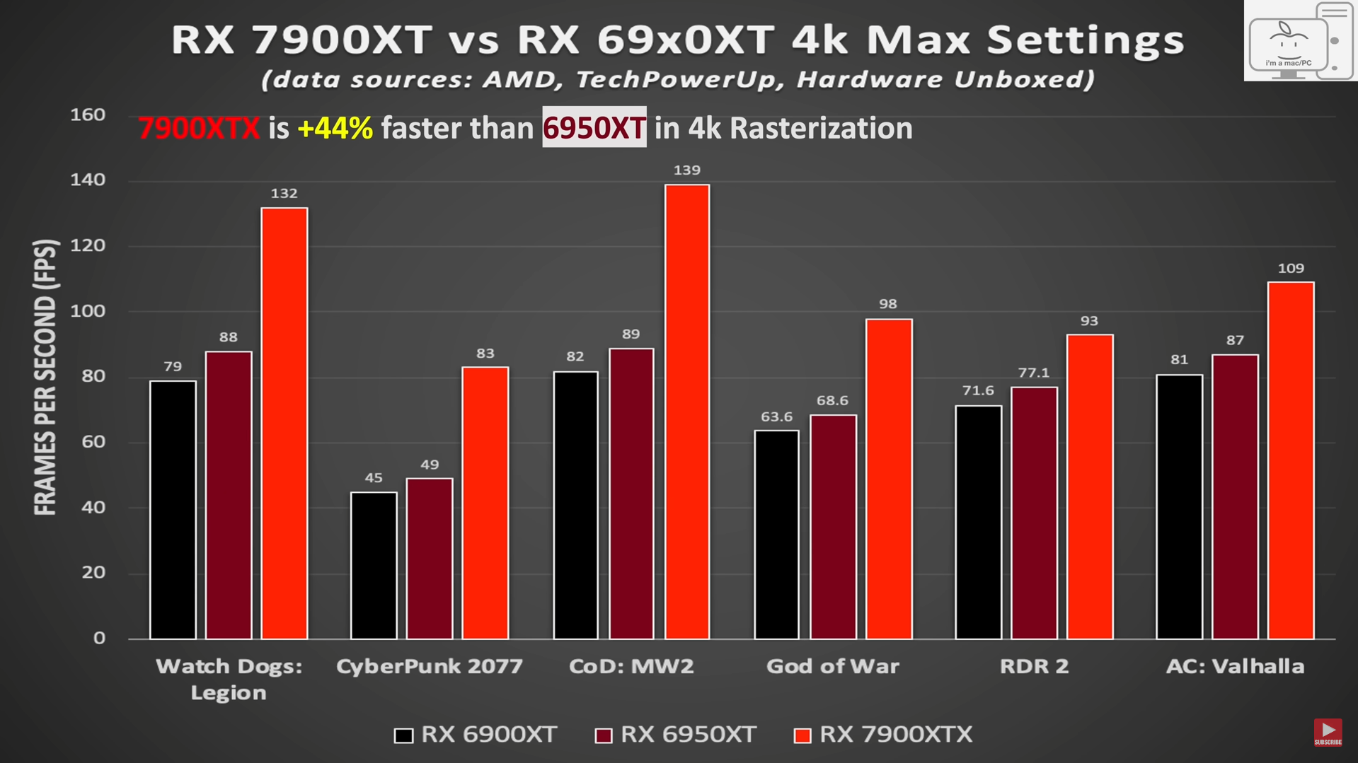 In raw 4K raster performance, the RX 7900 XTX is up to 1.7x faster than last gen’s RX 6950 XT. That is a huge jump in performance and almost on par with the RTX 4090. Hardware enthusiast, I’m a Mac unearthed these numbers and found out that the actual performance is only ~45% faster.