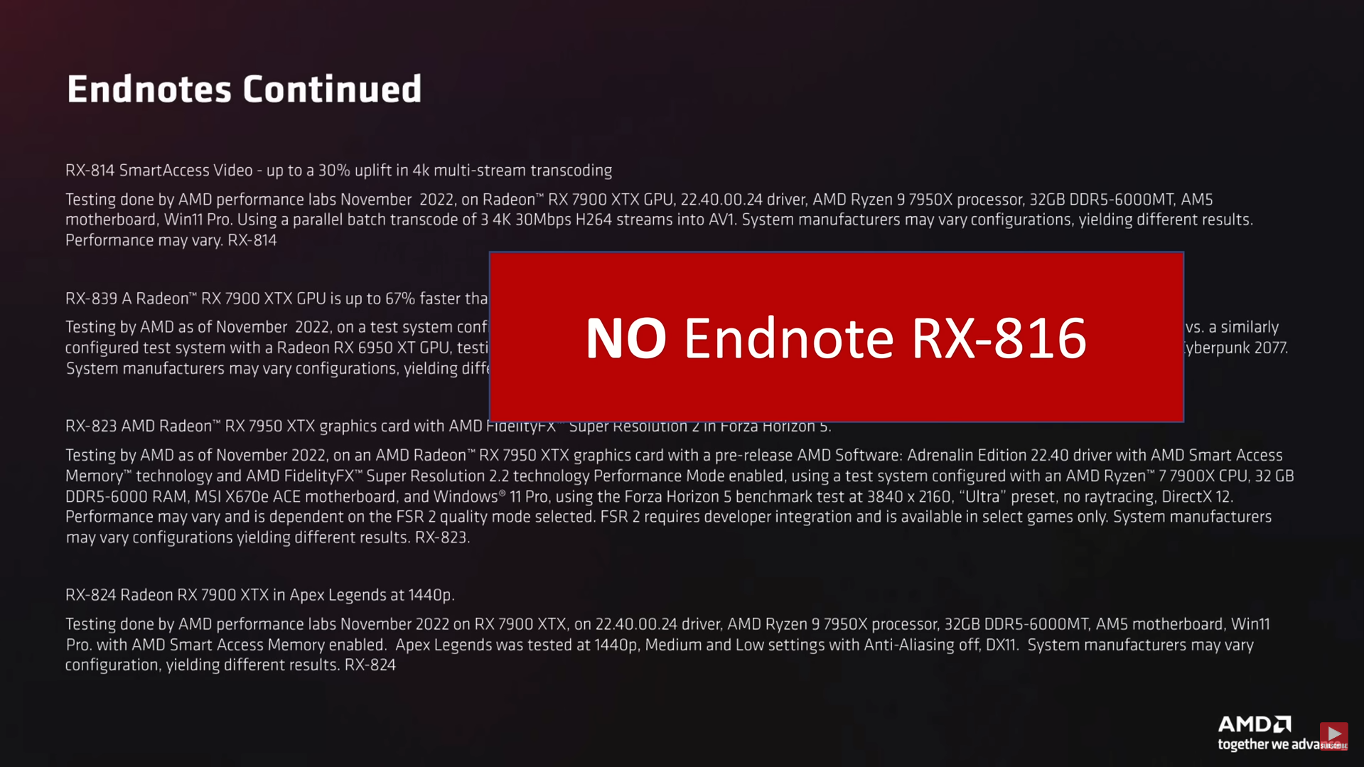 Many experts highlighted that the lack of endnotes in AMD’s presentation is not a good sign. Endnotes showcase where AMD get their charts/numbers from. For example, the 54% efficiency increase is probably for a certain GPU from the RDNA3 lineup. The very bottom right corner of the chart below (‘See endnote RX-816’) is a reference to which GPU was used for this metric.