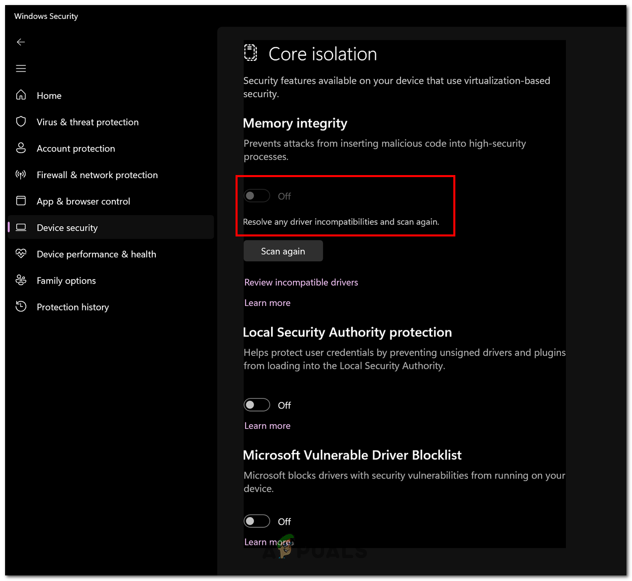 - Toggle the switch under ‘memory integrity’ to ‘off,’ as shown in the image below.
