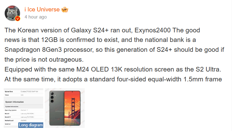 It was reported earlier this year that the upcoming S24 Ultra will feature the brighter M13 OLED screen, however according to industry insider, @UniverseIce, the S24+ might also receive the M13 2K OLED screen treatment.