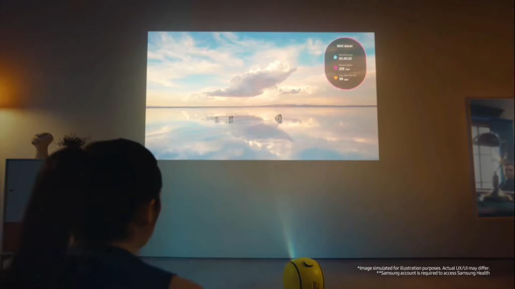 Ballie greets you when you walk into your house and follows you if asked. It can act as a screen for your phone and can be useful in situations where you need to video-call someone. Moreover, it can act as your fitness assistant, projecting workout videos, and (if connected to the Samsung Watch) displaying your stats alongside.