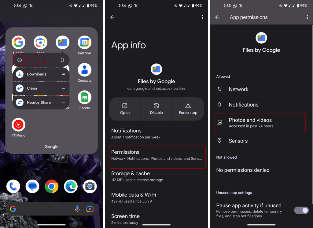 This issue might be due to insufficient permissions. To resolve it, long-press on the Files app, select ‘App info’, go to Permissions, and enable access for the ‘Photos and videos‘ option.