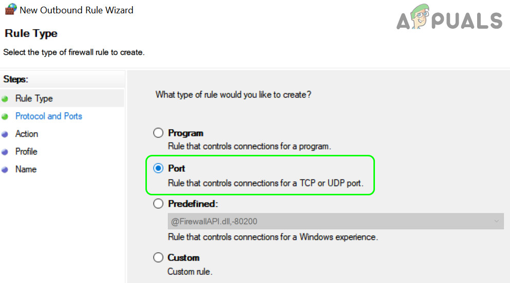 Create a New Outbound Rule in the Firewall - Then select Port as the Rule Type and select the radio button of TCP.