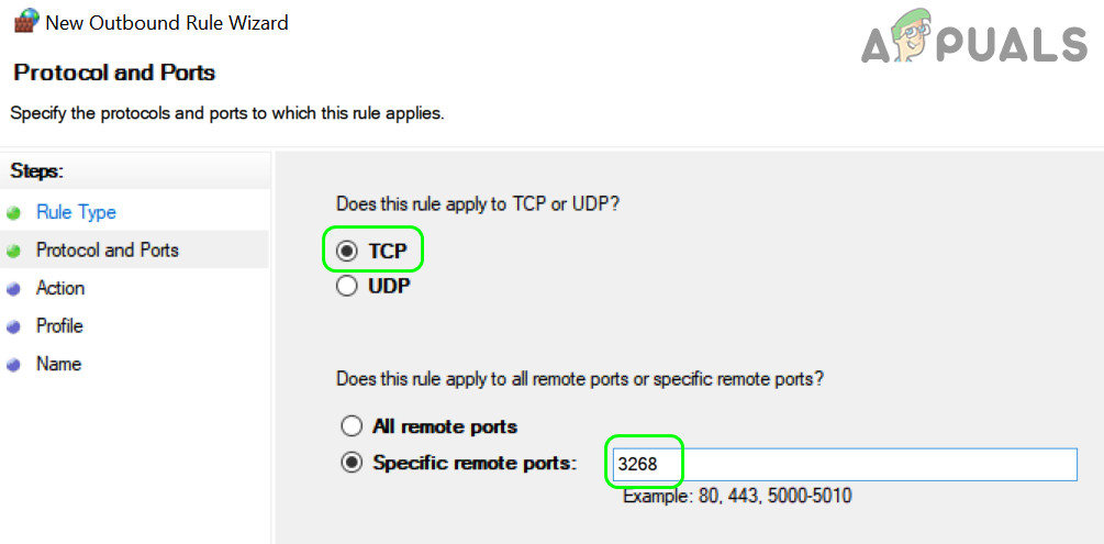 Select Port in the New Rule Window - Now enter 3268 in the Specific Remote Ports box.