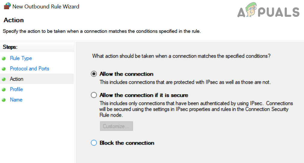 Select Allow the Connection in the New Outbound Rule - Now select all the three types of networks (i.e., Domain, Private, and Public) and click on Next.