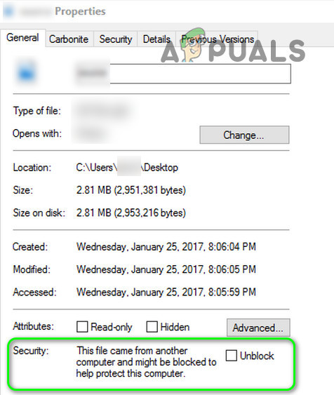 - Then check if an unblock option is available (either checkbox or button), if so, then click on it to Unblock the file.