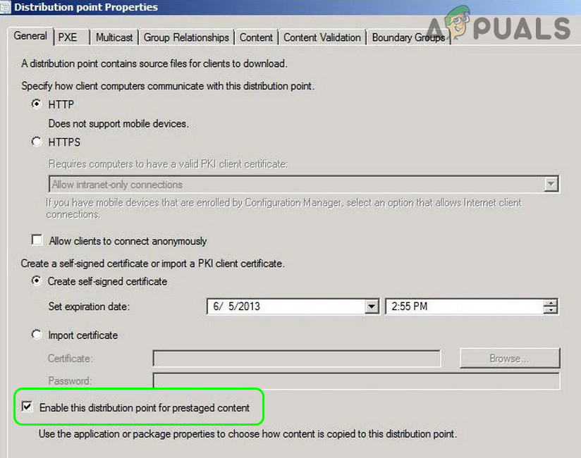 - Now remove the checkmark of Enable This Distribution Point for Prestaged Content and apply your changes.